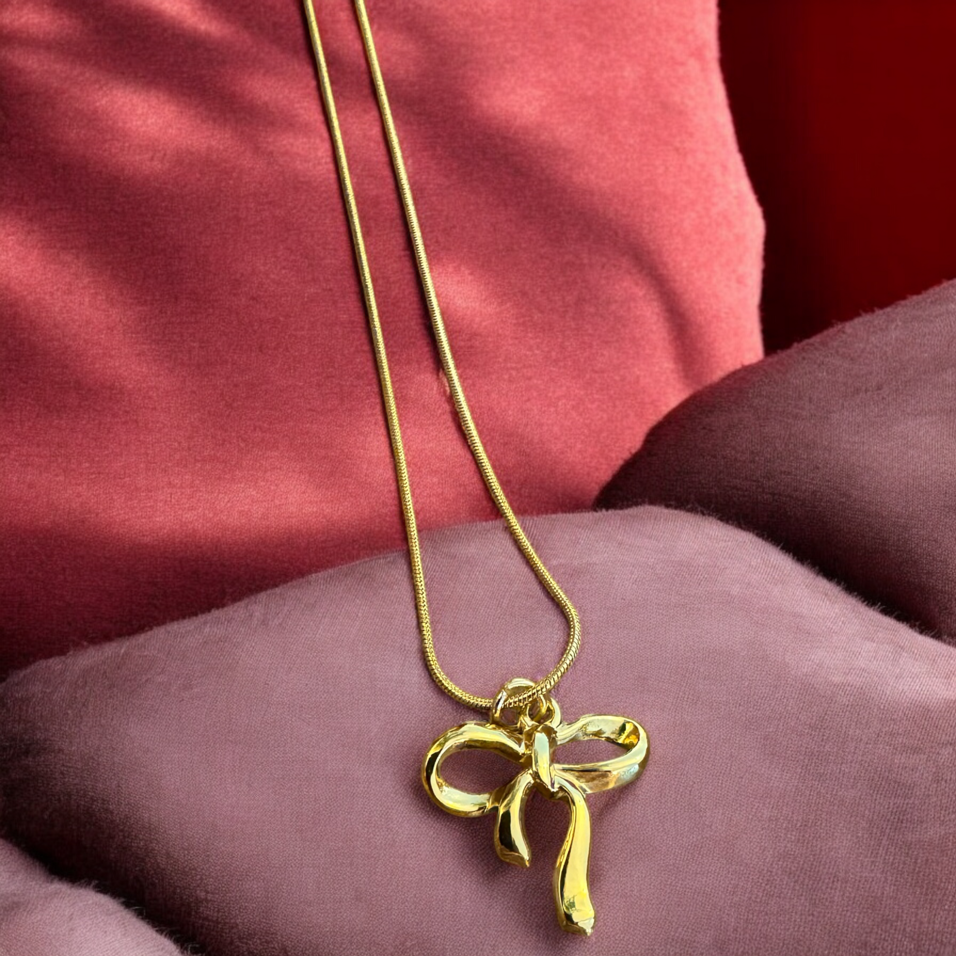 A Beautiful Bow pendant measuring 1.8 x 1.8 cm on a fine 1mm width snake style necklace. Approx 45cm length chain. Comes in one of our signature olive green Bloom & Brew fabric pouches which can also be used for polishing.