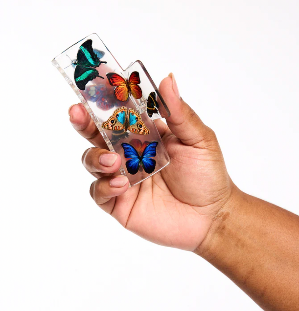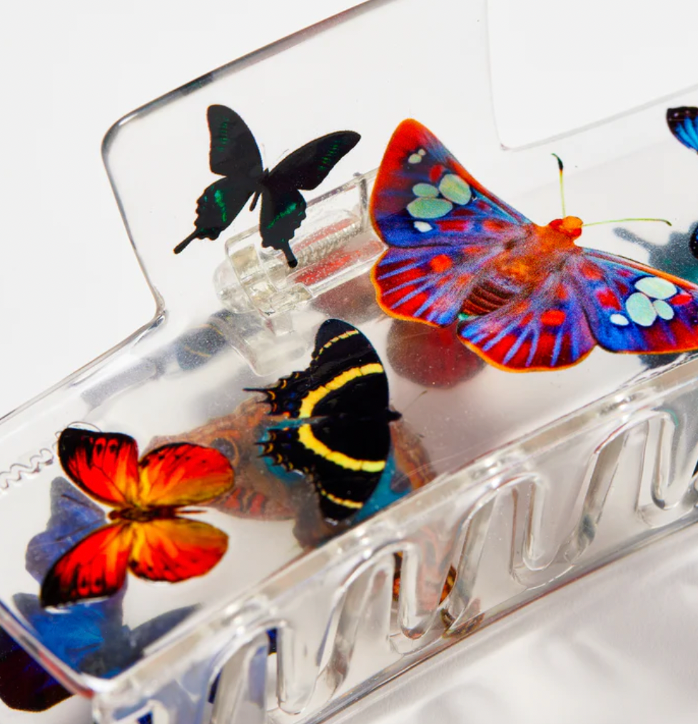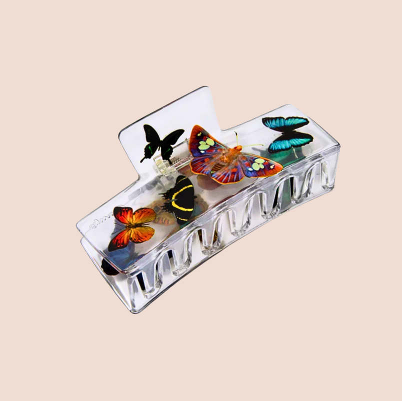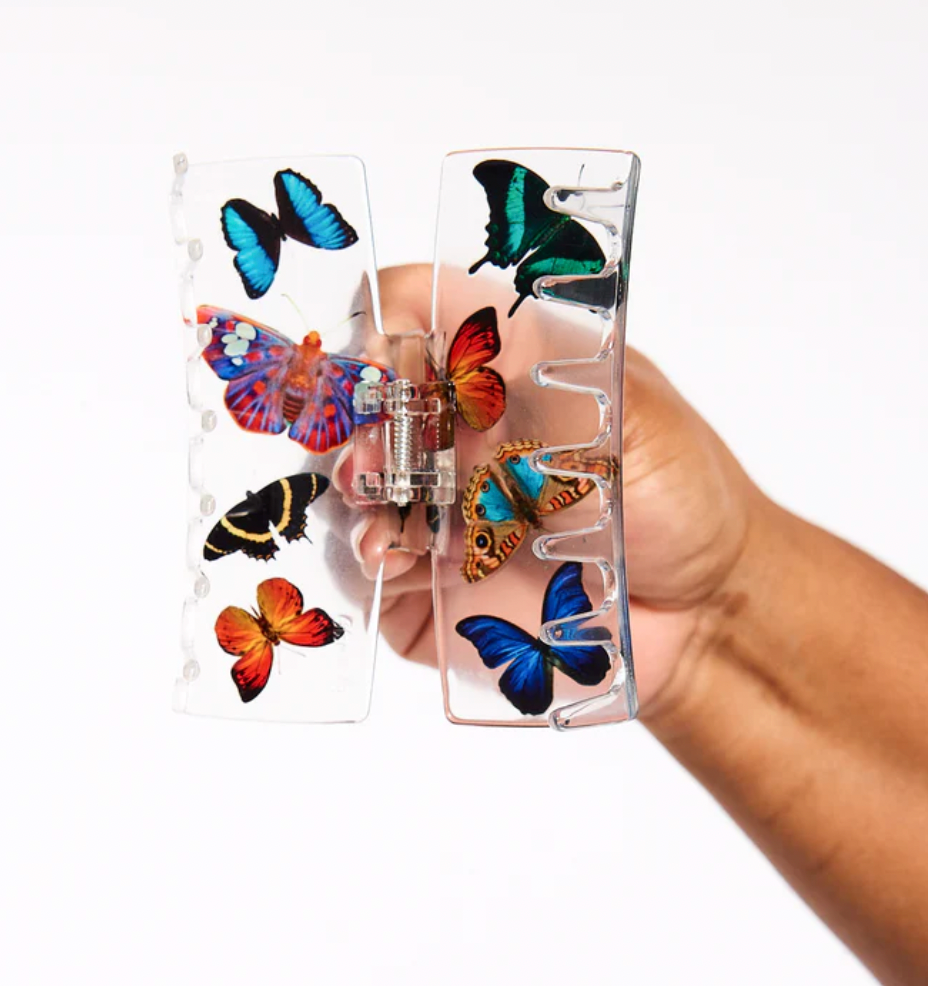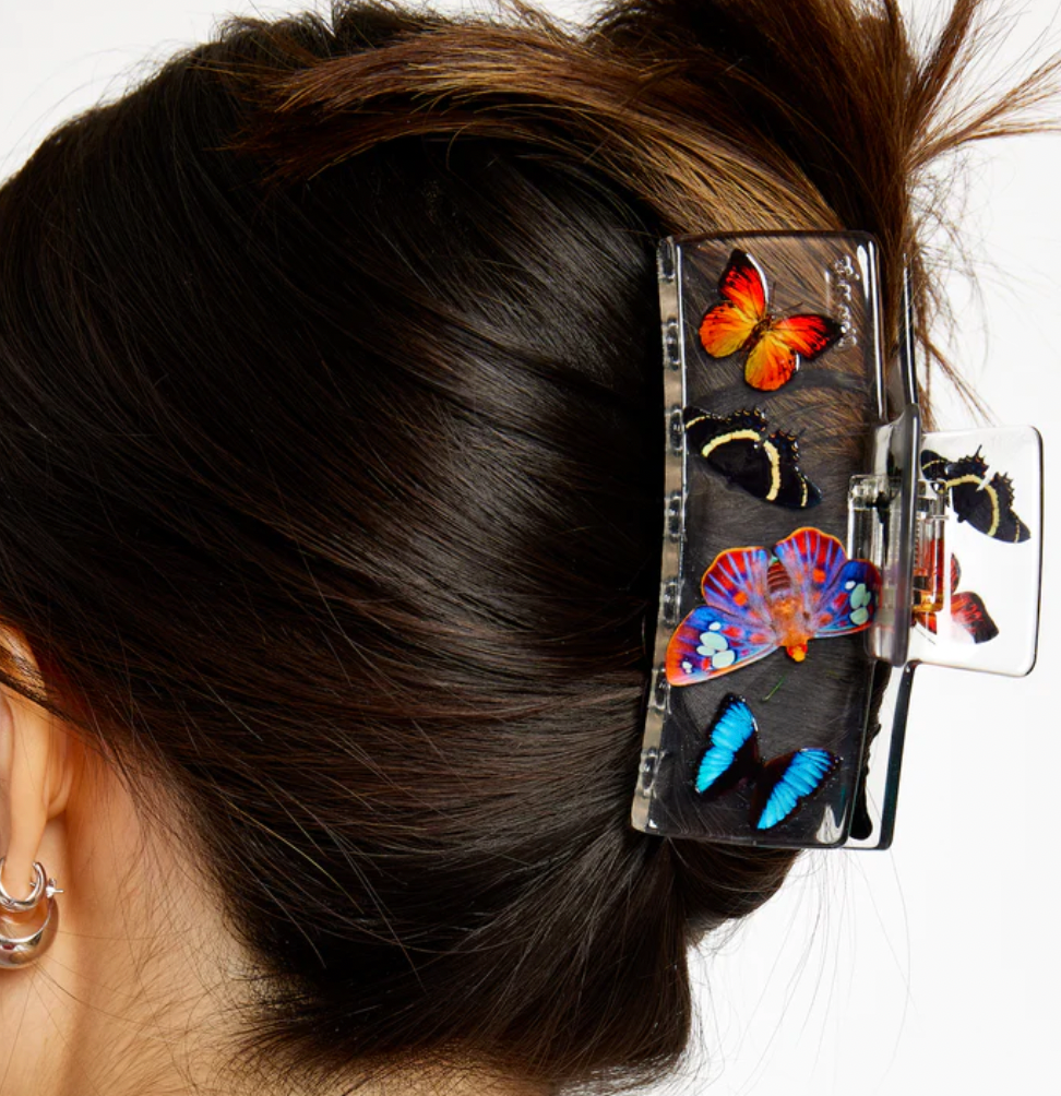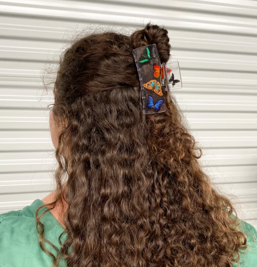 This medium/large-sized hair claw is super versatile and works for all hair types and textures. Measures approx 4"L x 2"H x 2"D Color: multicolor, clear, silver-tone hardware