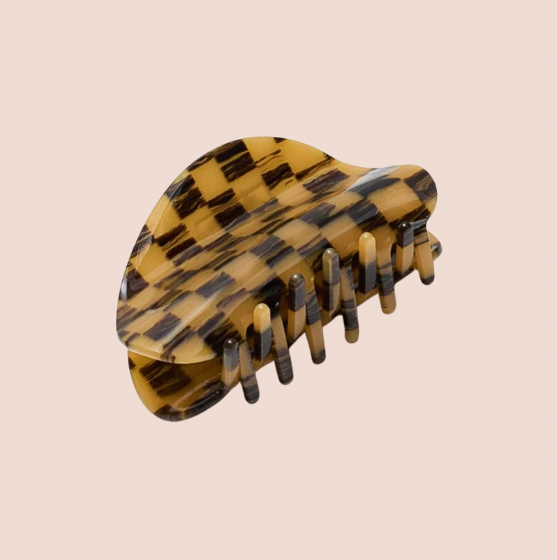 This medium-sized hair claw is super versatile and works for all hair types and textures. Measures approx 3.5"L x 1.75"H x 1.5"D