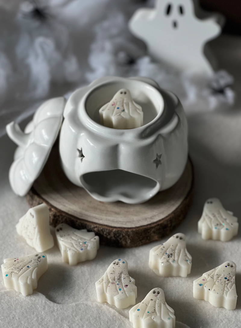 Start spooky season right with a box of our exclusive, hand-crafted ghost wax melts. Made in small batches for us by artist Liz in London, using eco-friendly coconut wax, each ghost is infused with cosy warm Amber scent. Place one in your wax warmer and enjoy 10–14 hours of hauntingly good aroma.