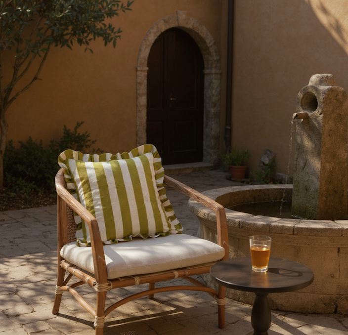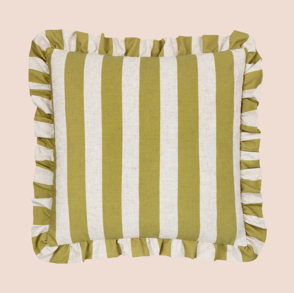 Add a touch of timeless style to your home with these beautiful new Linen Stripe Printed Ruffle cushions. Made from relaxed linen-look fabric, with olive green colour, it features bold stripes balanced by a refined ruffle trim for a playful yet sophisticated look. A timeless design that's perfect for all year round.
