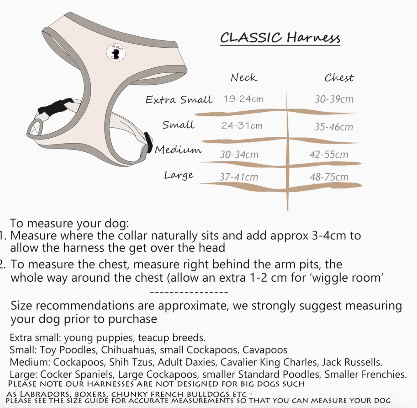 Larger dog? These harnesses are not designed for big dogs such as labradors, boxers, chunky french bulldogs or bigger.