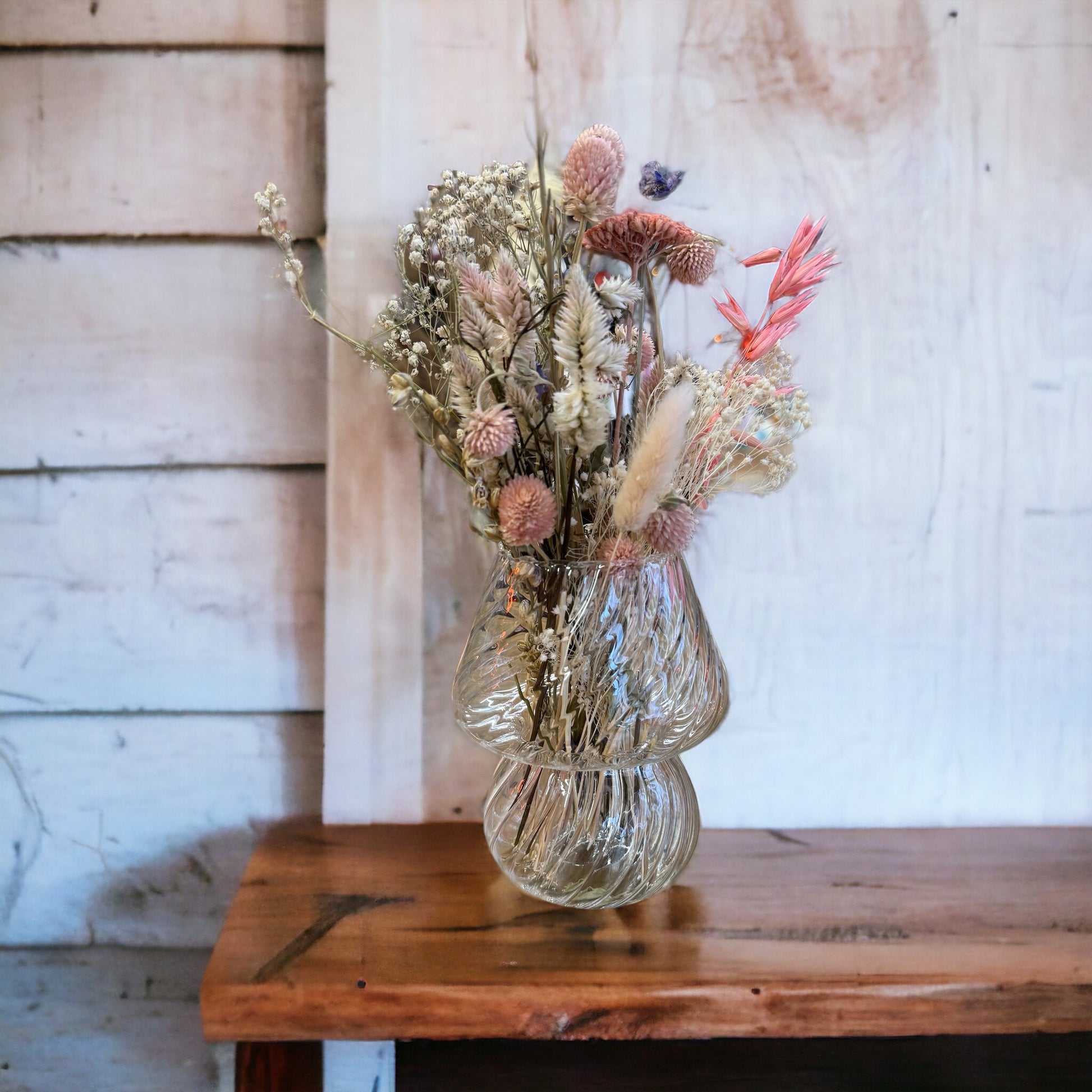 Elevate your spring decor with this beautiful new clear glass vase. Featuring a whimsical mushroom-style, murano inspired design, this vase is perfect for showcasing your favourite flowers and bringing a touch of nature into your home. We love it with tulips or dried flowers! The unique design means you can also flip this around to become a tealight holder too. Also comes in Peach colour.