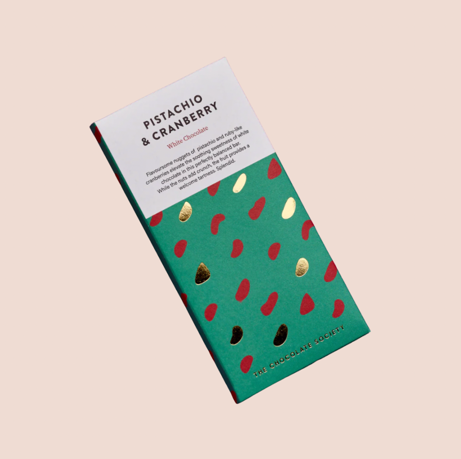 Ingredients: White Chocolate (36% Cocoa Minimum, Pure Cocoa Butter): Sugar, Cocoa Butter, Whole Milk Powder, Emulsifier: Soya Lecithin, Natural Vanilla Flavouring. Organic Dried Cranberries (8%): Cranberries, Sugar, Vegetable Oil. Pistachios (4%).