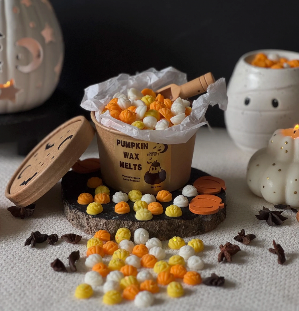 Illuminating Halloween vibes with our Scary Pumpkin Wax Melt scoop tubs! Prepare to embrace the allure of Halloween with these cute pumpkin wax melts, with mini orange, yellow & white pumpkin faces scented with seasonal & cosy pumpkin spice fragrance.
