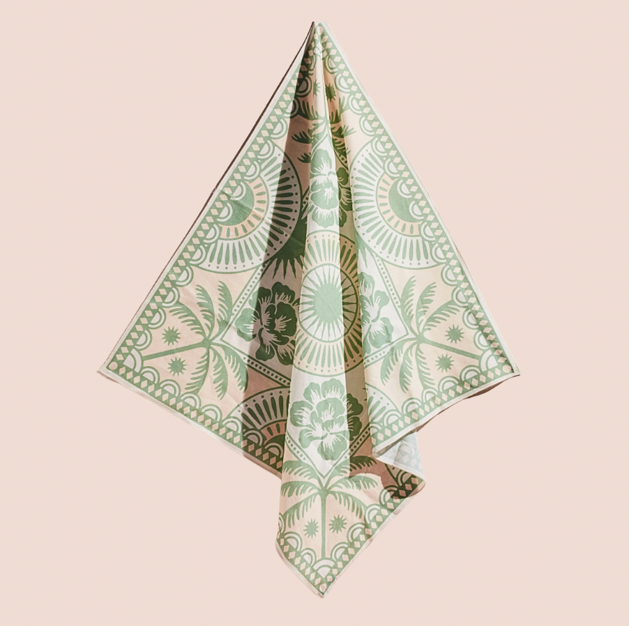 Add a touch of sophistication to your ensemble with the Quindio Bandana in Sage. Crafted from 100% GOTS-certified organic cotton, this 55 x 55 cm (21" x 21") bandana features a bold, colourful design that can be styled as a headscarf, necktie, or wrist accessory. Ethically handmade in India, it's both sustainable and versatile.
