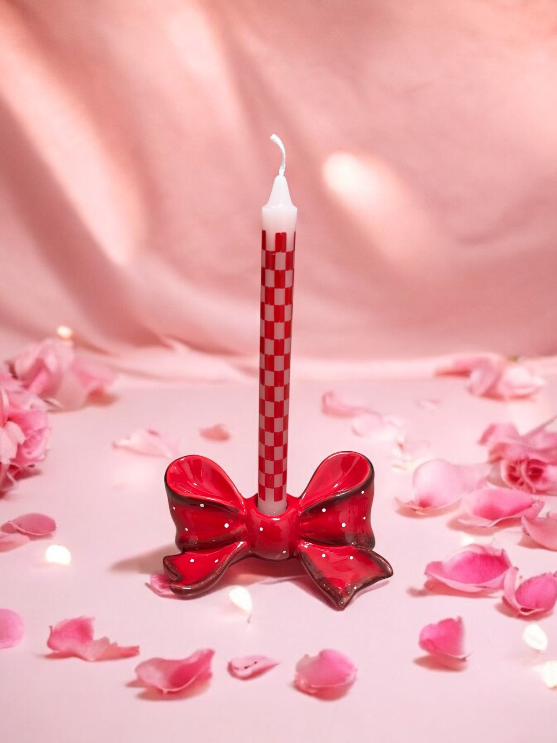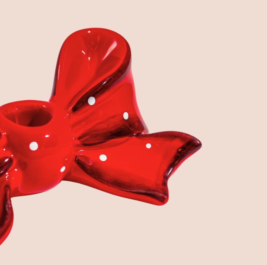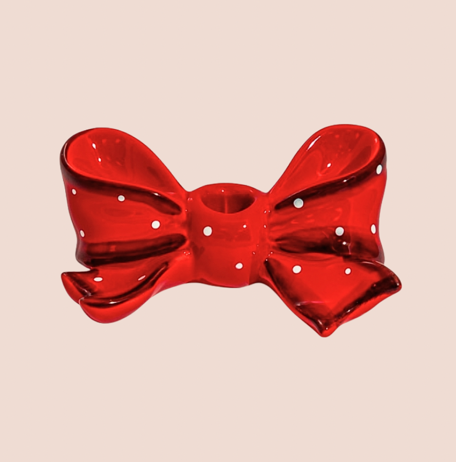 Add a touch of coquette chic to your dinner table with our Ceramic Bow Candlestick Holder. Hand painted bow shaped ceramic holder, with red base and tiny white polka dots design, this holder is a gorgeous feature for any dinner table, fireplace or wall shelf.
