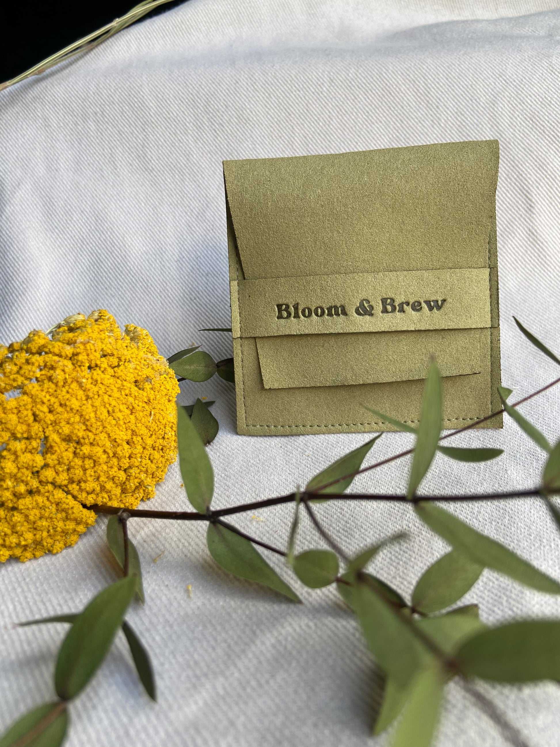 Each piece of jewellery comes in one of our olive Bloom & Brew pouches, to keep your jewellery safe in & which can also be used for polishing.