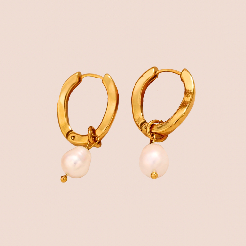 These hoops feature a slight wave shape and measure 16mm wide and 36mm height including the faux pearl charm.