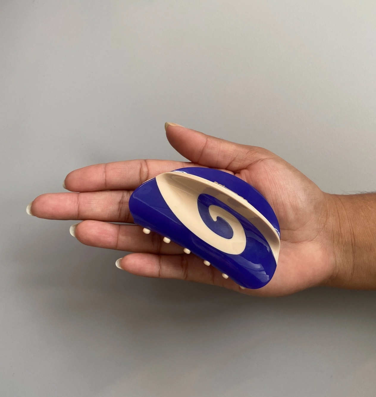 Suki Claw: This medium size hair claw is super versatile and great for all hair types and textures. Measures approx 3.5"L x 1.75"H x 1.75"D Color: blue & ivory with silver tone hardware. Due to the handmade nature, every clip is unique in pattern and shade.