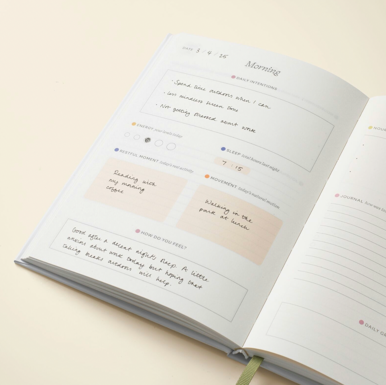 - 12 weeks worth of daily overview pages (two-page spread for each day), with space for logging intentions, sleep and energy levels in the morning and evening