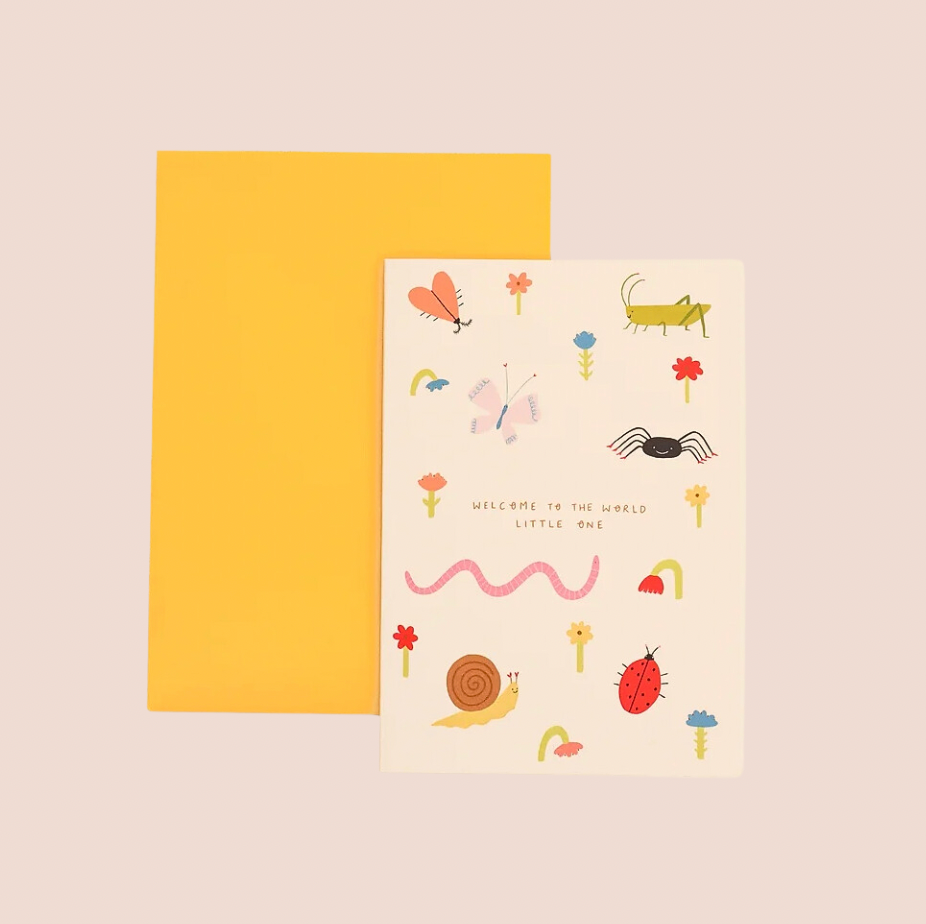 Welcome the newest addition to the world with this colourful new baby card. Featuring an array of colourful illustrated bugs and blooming flowers. Send this card to congratulate new parents on a lifetime of love, joy and happiness.
